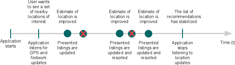 Figure 2. A timeline representing the window in which the user location is obtained and listening stops when the user consumes the current location.